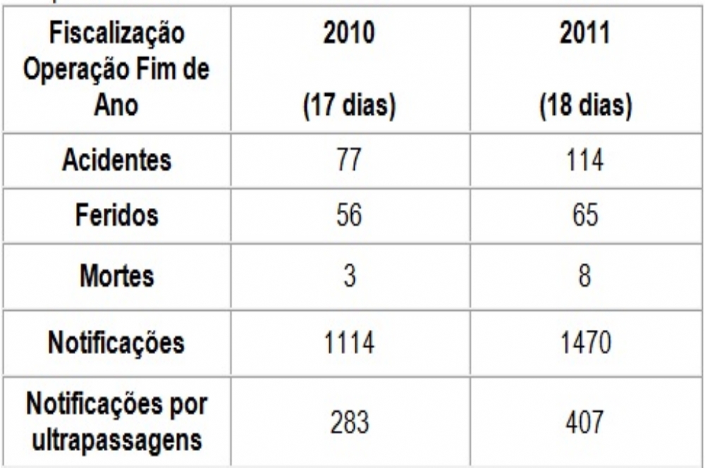 A Polícia Rodoviária Federal (PRF) no estado de Sergipe apresenta o balanço da Operação Fim de Ano 2011. Entre os dias 16 de dezembro de 2011 e 02 de janeiro de 2012 (período da operação), foram registrados nas rodovias federais do estado 114 acidentes, com 65 feridos e 08 mortes.